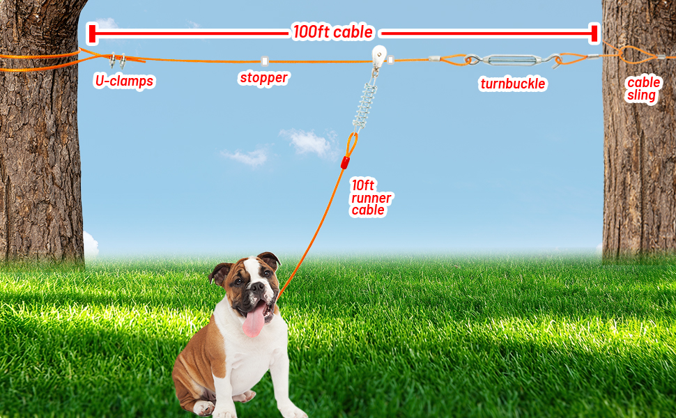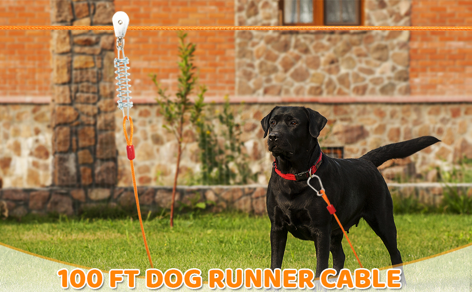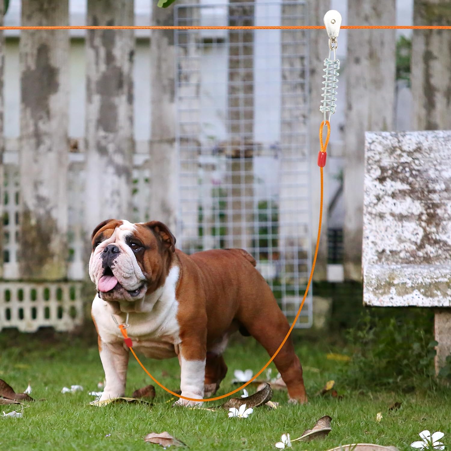 This 100 ft dog tie out cable provides your dog with a free range of outdoor activities, while also preventing your pet from accidentally getting lost while playing outdoors. Compared to a typical dog cable stake, using the trolley dog tie out cable can minimize the chances of your dog getting into an accident.