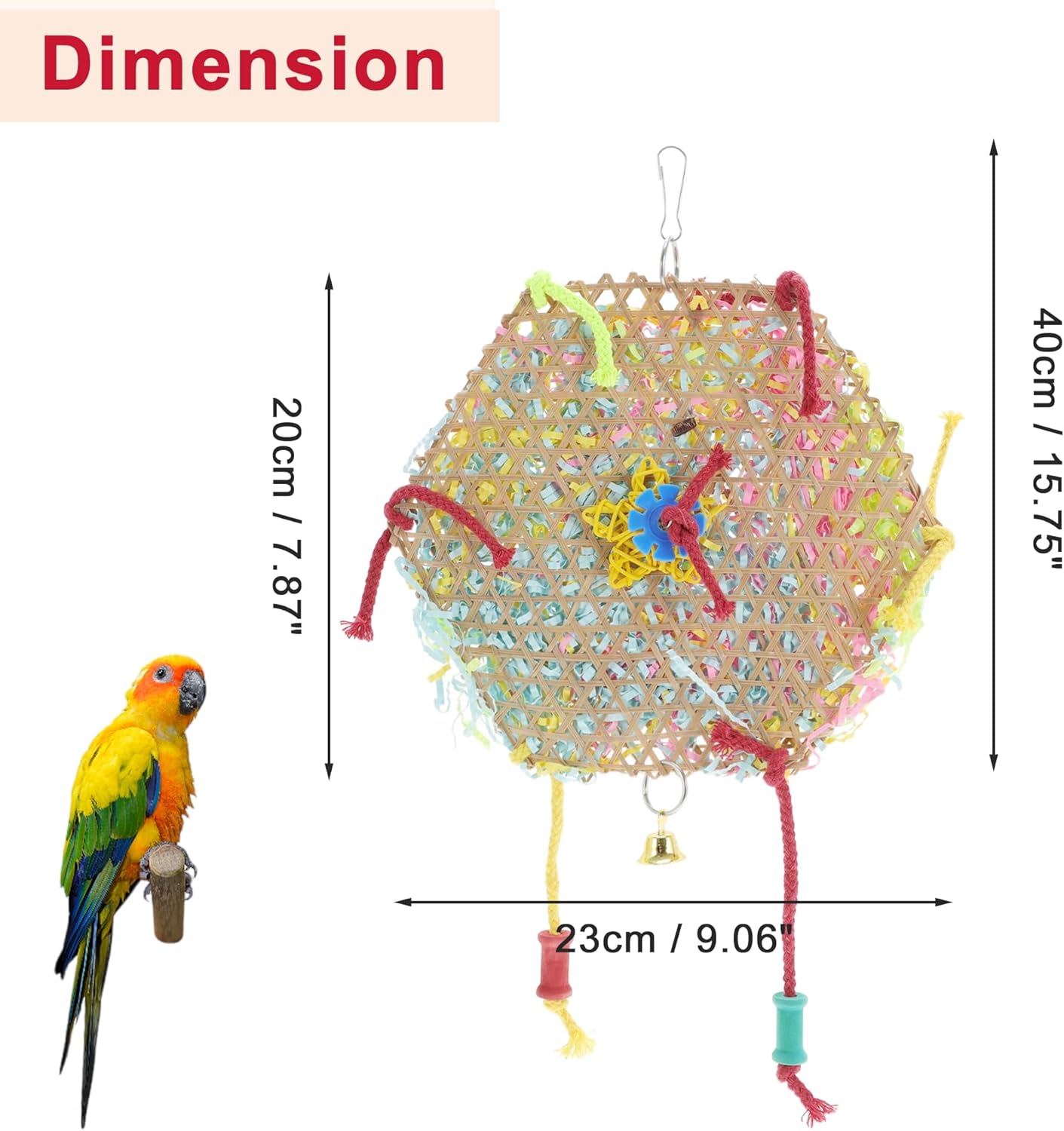 This bird chewing toy offers various textures and shapes to keep your feathered friend engaged, entertained, and mentally stimulated. It provides a safe outlet for natural chewing instincts.Crafted from bird-safe materials, these bird toys ensure the well-being of your pet. Free from harmful chemicals, it promotes good playing and minimizes risks associated with ingestion.The parrot toys feature a colorful and interactive design that encourages physical activity and mental engagement. Birds can explore, promoting overall well-being and reducing boredom.Made from sturdy materials, these bird toys for parrots are designed to withstand daily use and bird-beak interactions. Its durable construction ensures long-lasting entertainment for your feathered companion.The bird toys for conures come with easy-to-attach hooks for quick installation in your bird’s habitat. It can be placed in various locations within the cage, offering flexibility and enhancing the bird’s environment.