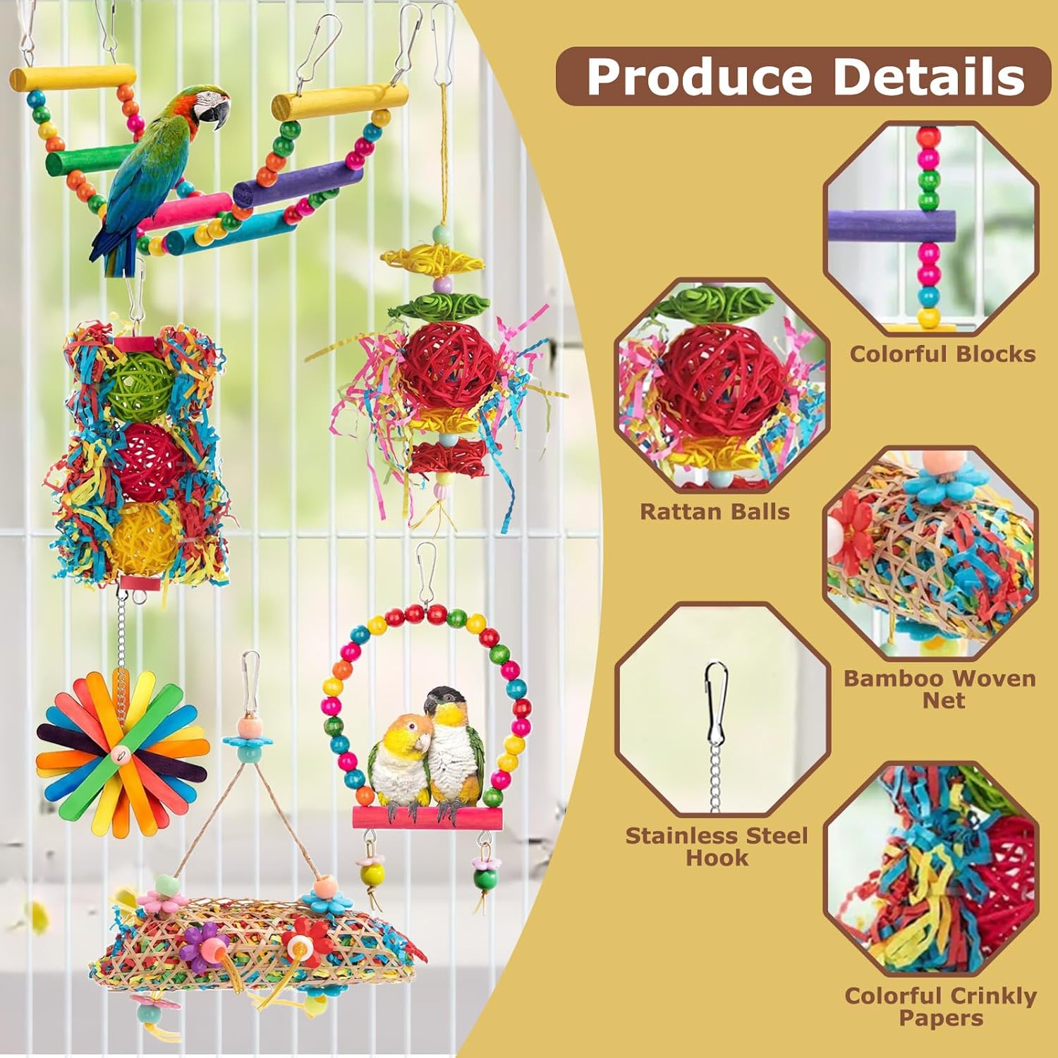 【Multi Function Bird Toys】: A six variety of colorful bird toys, including 1 hammock climbing ladder, 1 swing, 1 colored popsicle sticks toy and 3 pcs bird shredder toys with brightly colored crinkly paper and rattan bal, provide your birds a good elevated place to meet your birds’ natural needs. Colorful wooden toys and parrot chew toys can attract the attention of pet birds and suitable for parrot sports, standing, climbing, playing, chewing, foraging, resting etc. 6 pcs different bird toys will make your bird cage looks like a bird mansion.