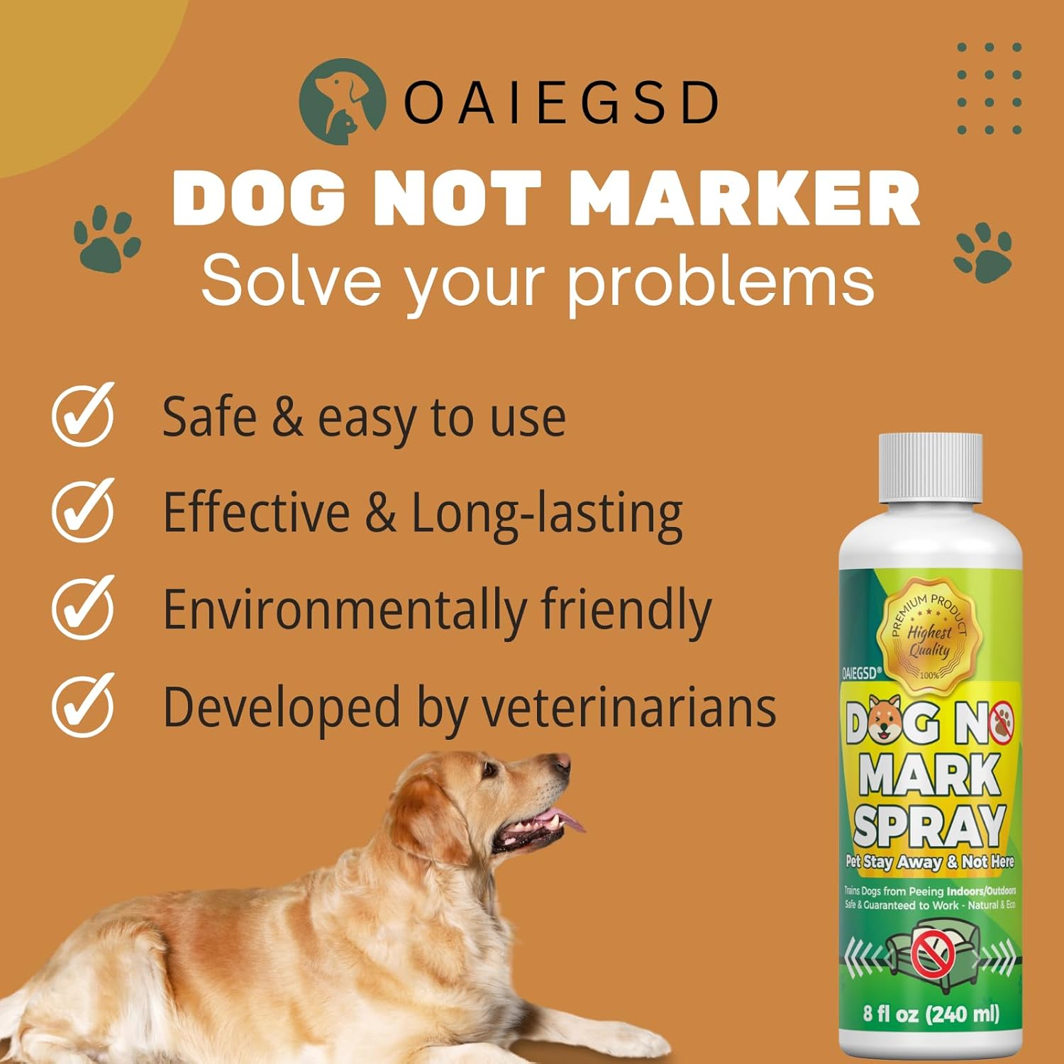 SAFE HUMANIZED FORMULA: Our specialized formula was developed by professional veterinarians using natural ingredients and is completely safe for your pet and home.OAIEGSD No More Marking is safe to use on carpets, couches, corners and more.