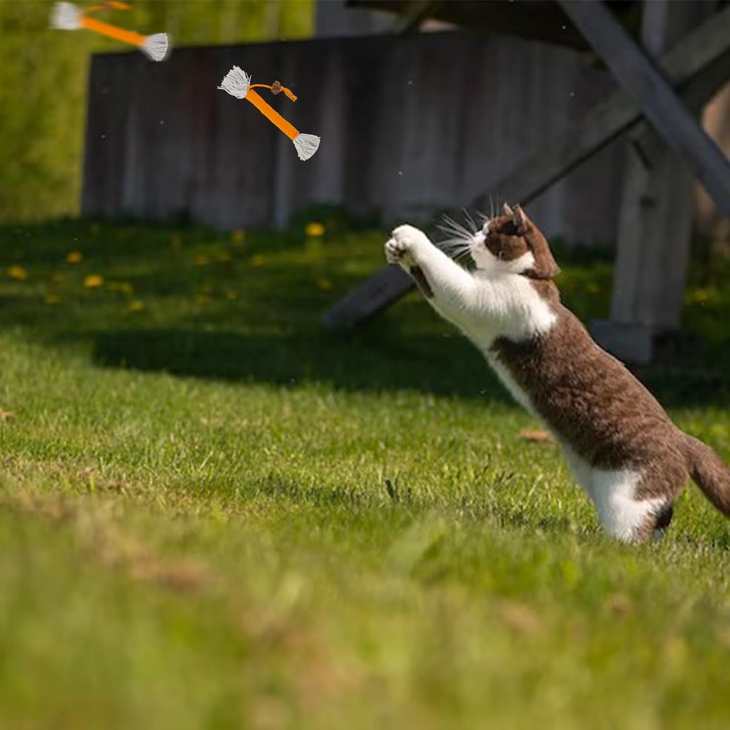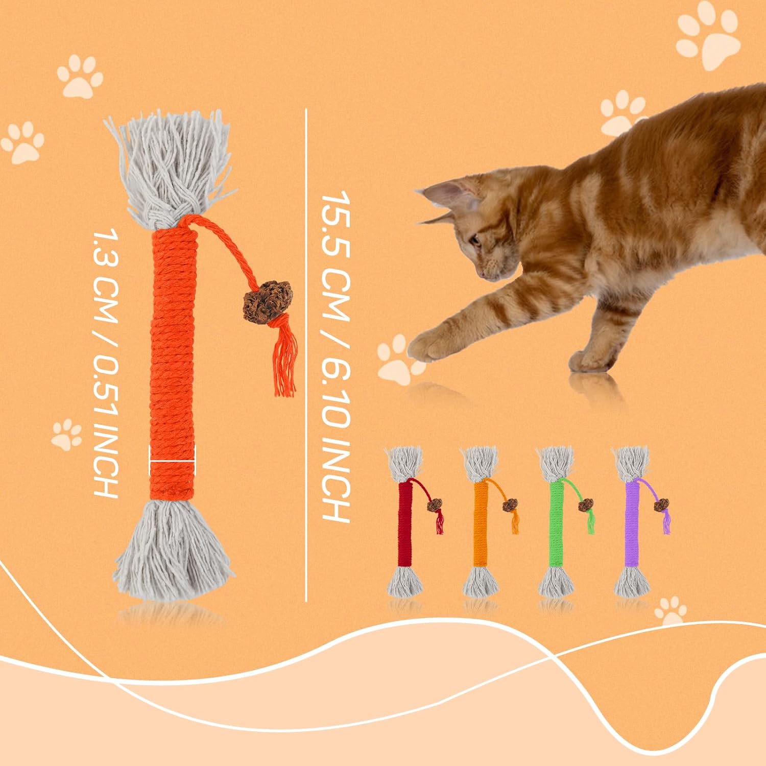 5 in a Set: The cat chewing rope set comes with 5 packs of cat kicker toys in different colours. Cats love bright colours. The cat chew sticks come in 5 classic colours – yellow, green, red, purple and orange, which quickly grab your cat’s attention