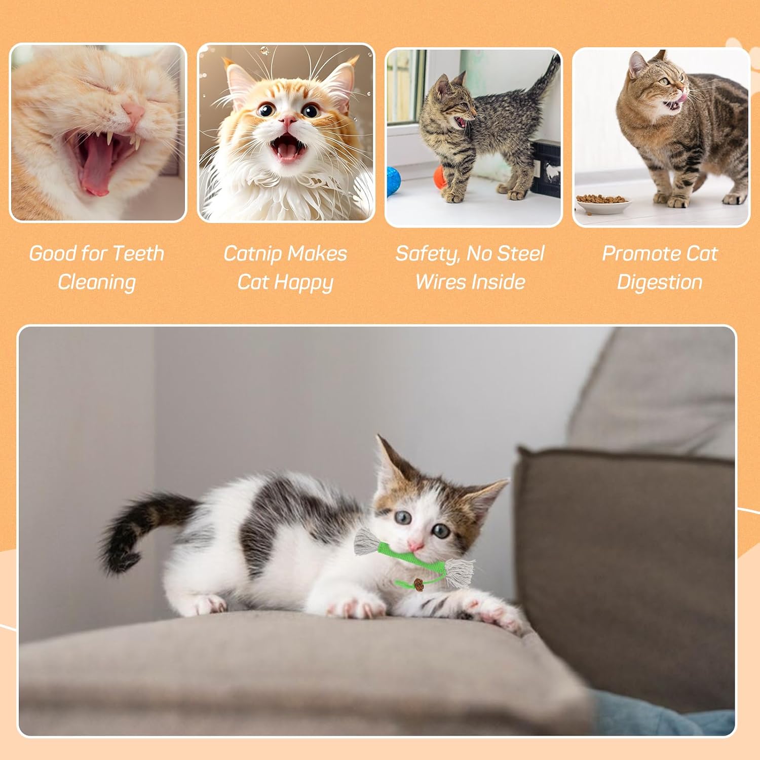 Grinding and Cleaning Teeth: The cat chew stick is designed with double thickened cotton rope twisting, which is resistant to biting and does not easily fall off. Our kitten teething toys can also help dental health, with the effect of teeth grinding and cleaning
