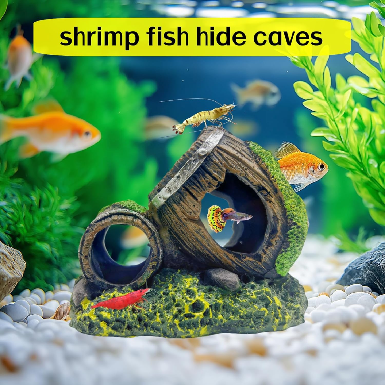 Aquarium Broken Barrel Decor,Fish Tank Shrimp Hide Cave Barrel with Green Moss, Cute Small Fish Hide Caves for Neon Tetras Guppy Shrimp Crab Cichlids Betta Hideout Hide House