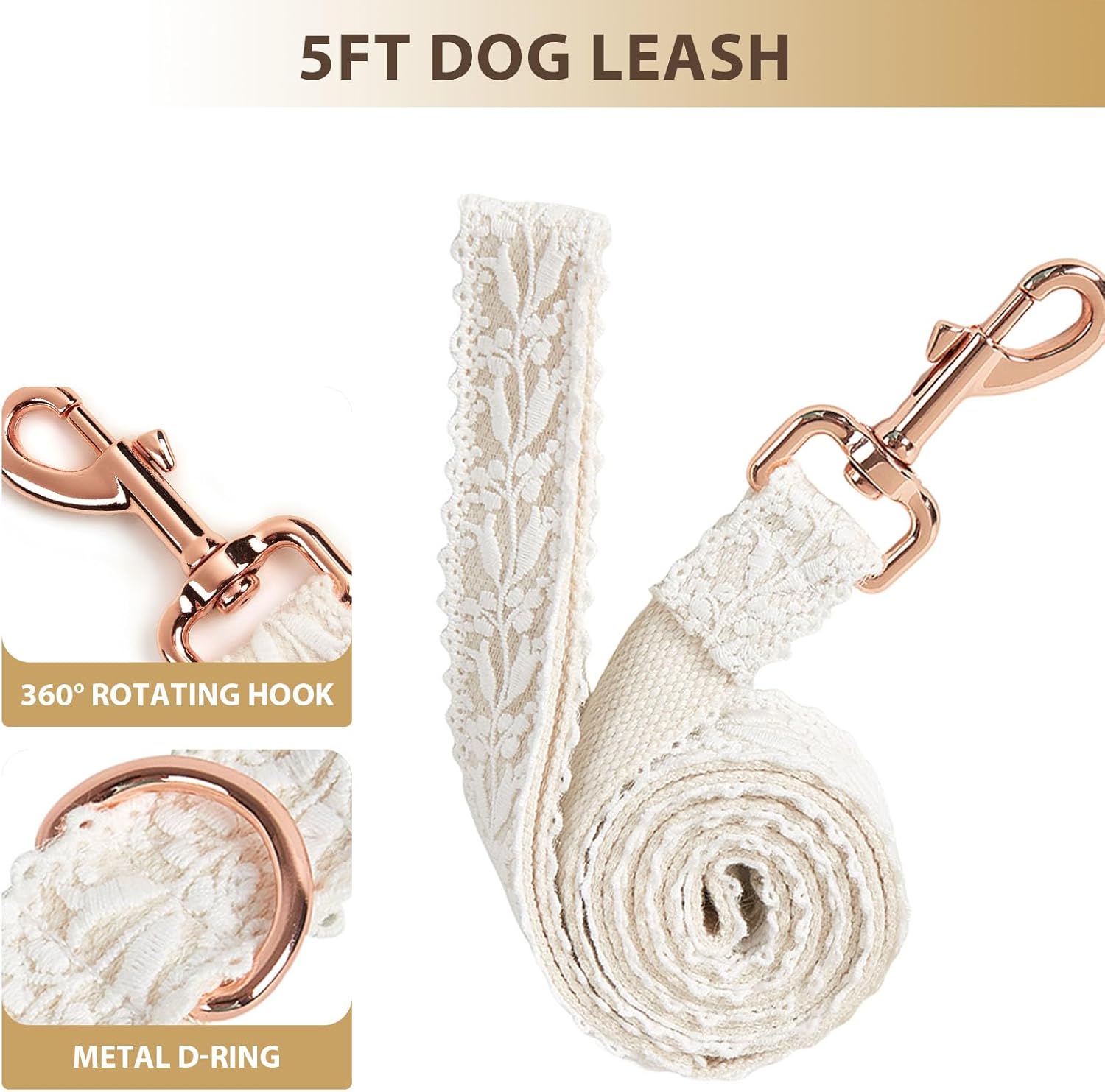Beige Dog Collar and Leash Set Adjustable Lace Dog Collar for Large Dogs with Flowers & Rose Gold Metal Clasp for Pet Wedding Birthday Outfit,L