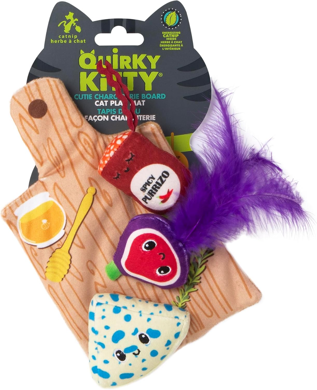 Quirky Kitty Cutie Charcuterie Board Play Mat is an interactive cat toy suitable for all breeds and sizes. This fun toy pack includes a crinkly cutting board play mat, a cute cheese wedge, fuzzy fig, and sassy salami toy, all filled with potent, pesticide-free North American grown catnip that attracts cats to play. Cats will love to play and roll on the crinkly crackly cutting board, and the cute plush toys are the perfect size to bat, pounce, chase, and hunt. Enticing real feathers mimic prey, encouraging cats’ natural hunting behaviors and providing a healthy outlet for their playful energy. Quirky Kitty cat toys are designed with both cats and their parents in mind, understanding your cat’s natural instincts is essential in forging a strong bond with your pet. Both fun and functional, Quirky Kitty durable plush cat toys are the perfect tool for exercising and entertaining house cats.