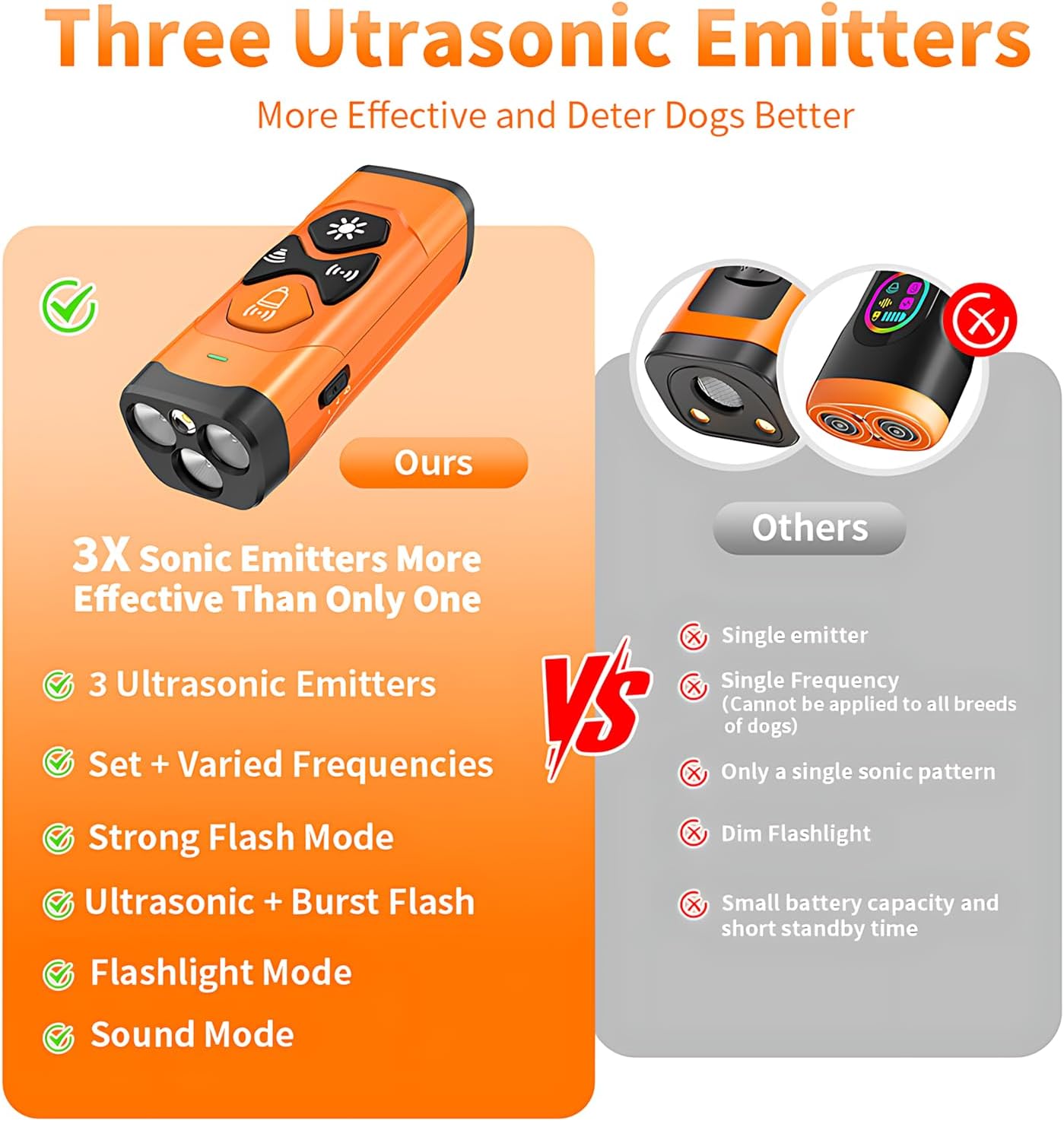 【3 Modes,1 Effective Result】:This dog bark deterrent device offers 3 different modes,each designed to achieve a single goal—to instantly capture your dog’s attention and discouraging unwanted behaviors. Does your dog bark,dig,chase,or chew? No more worries! You’ll be amazed at how quickly and painlessly your pup responds to this innovative no-bark training device.The ultrasonic feature ensures a humane and effective training experience.