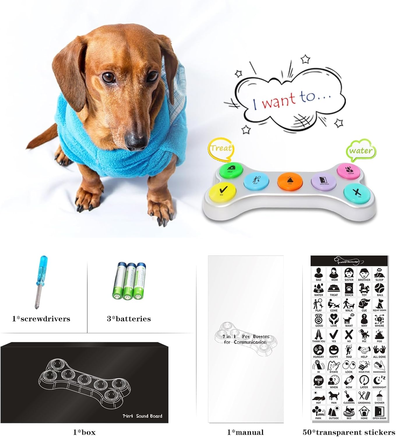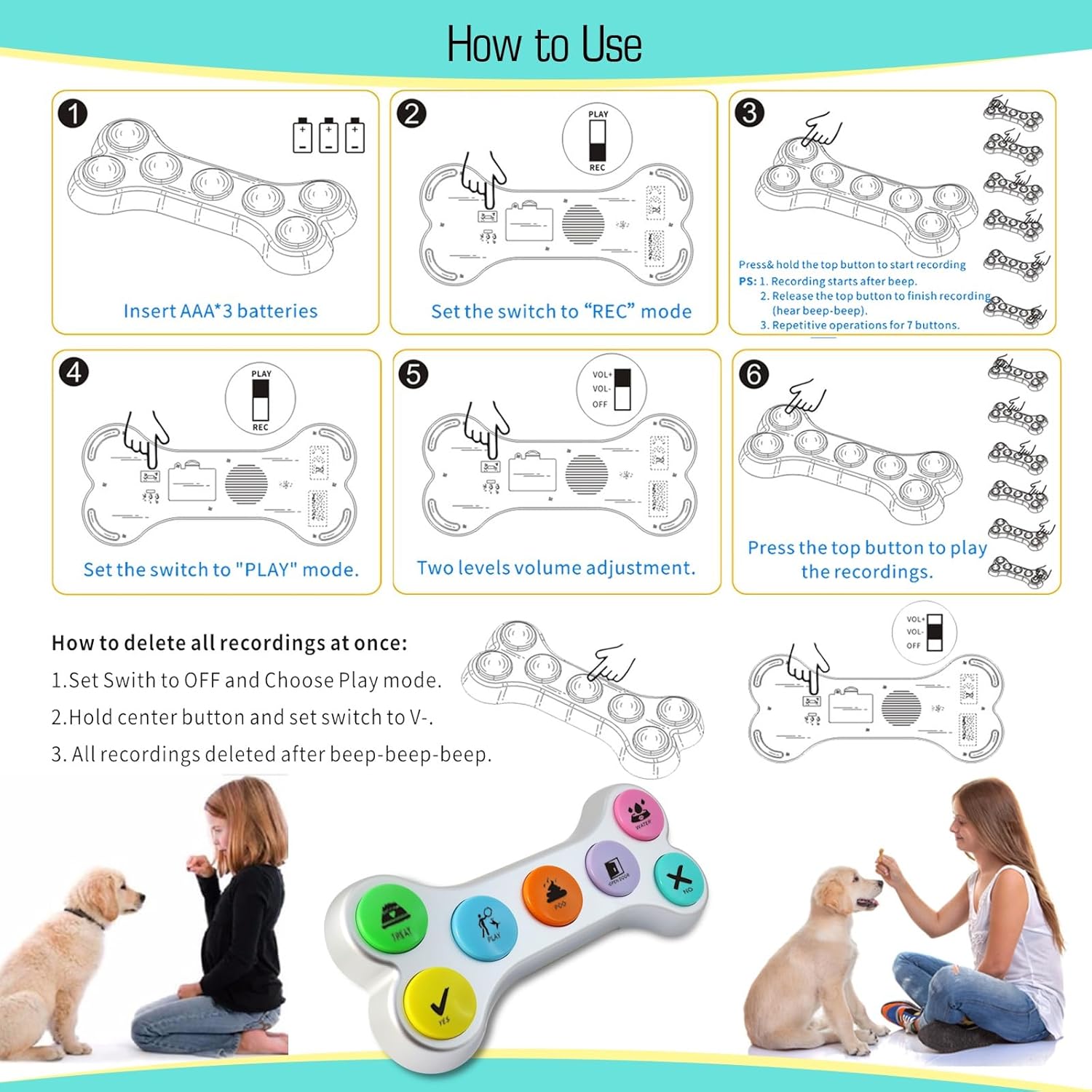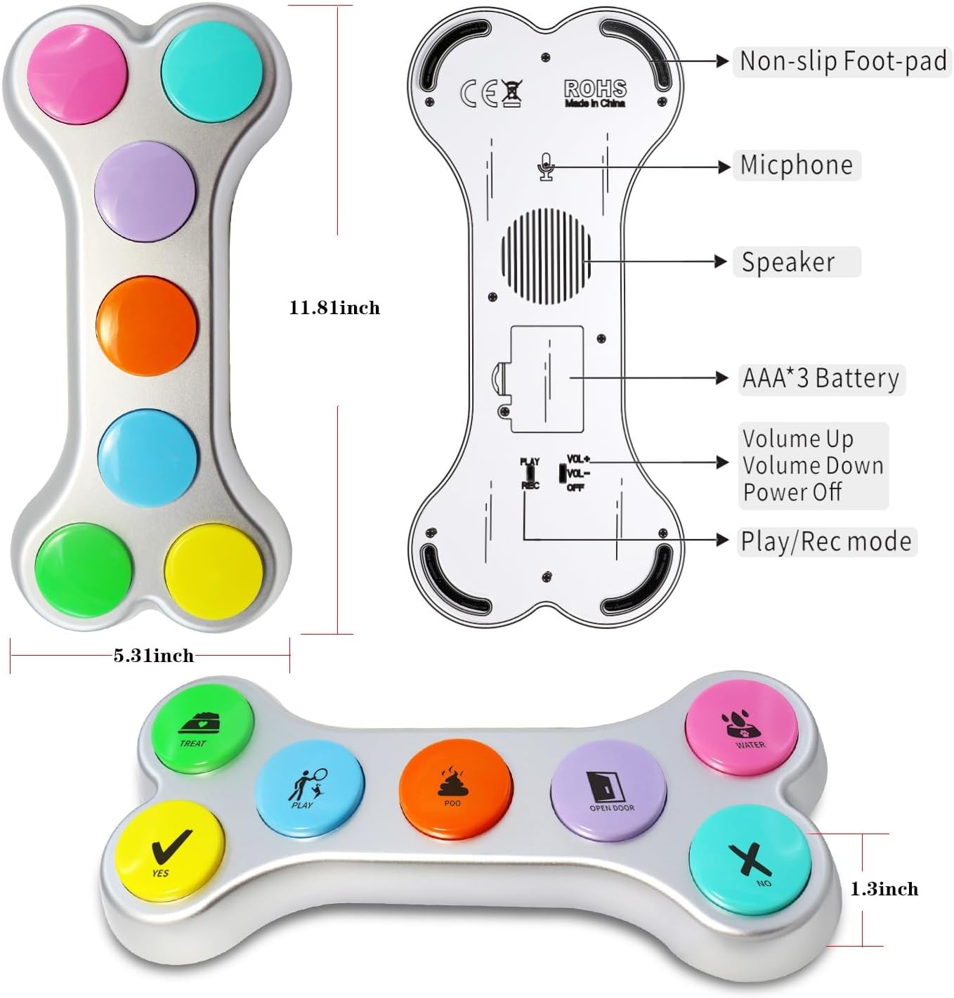Dog Buttons For Communication: By recording commands like ‘FOOD’, ‘EAT’, ‘DRINK’, ‘PLAY’, ‘YES’, ‘NO’, and more, you can establish a means for your pet to express their needs and desires. The dog talk button set is suitable for all types of dogs, whether they are small, medium, or large breeds