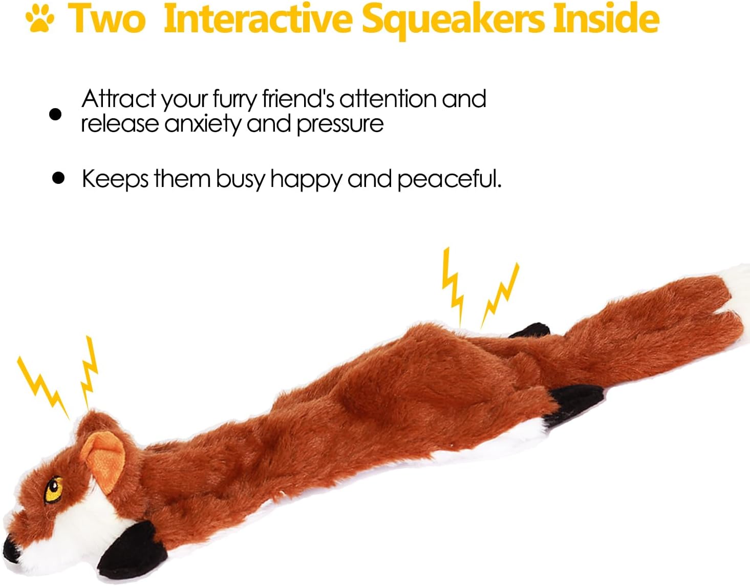 Safe and Premium Quality: Made of non-toxic premium quality plush fabric, incredibly safe, super soft, durable and washable.Length of Skunk and Tiger is 23.62 inch, Squirrel Fox and Lion is 17.71 inch, easy for small, medium and large dogs to carry, tug of war, and roll around with. Intensive fabric and better stitching make these dog squeaky toys more durable for your pets to play with.