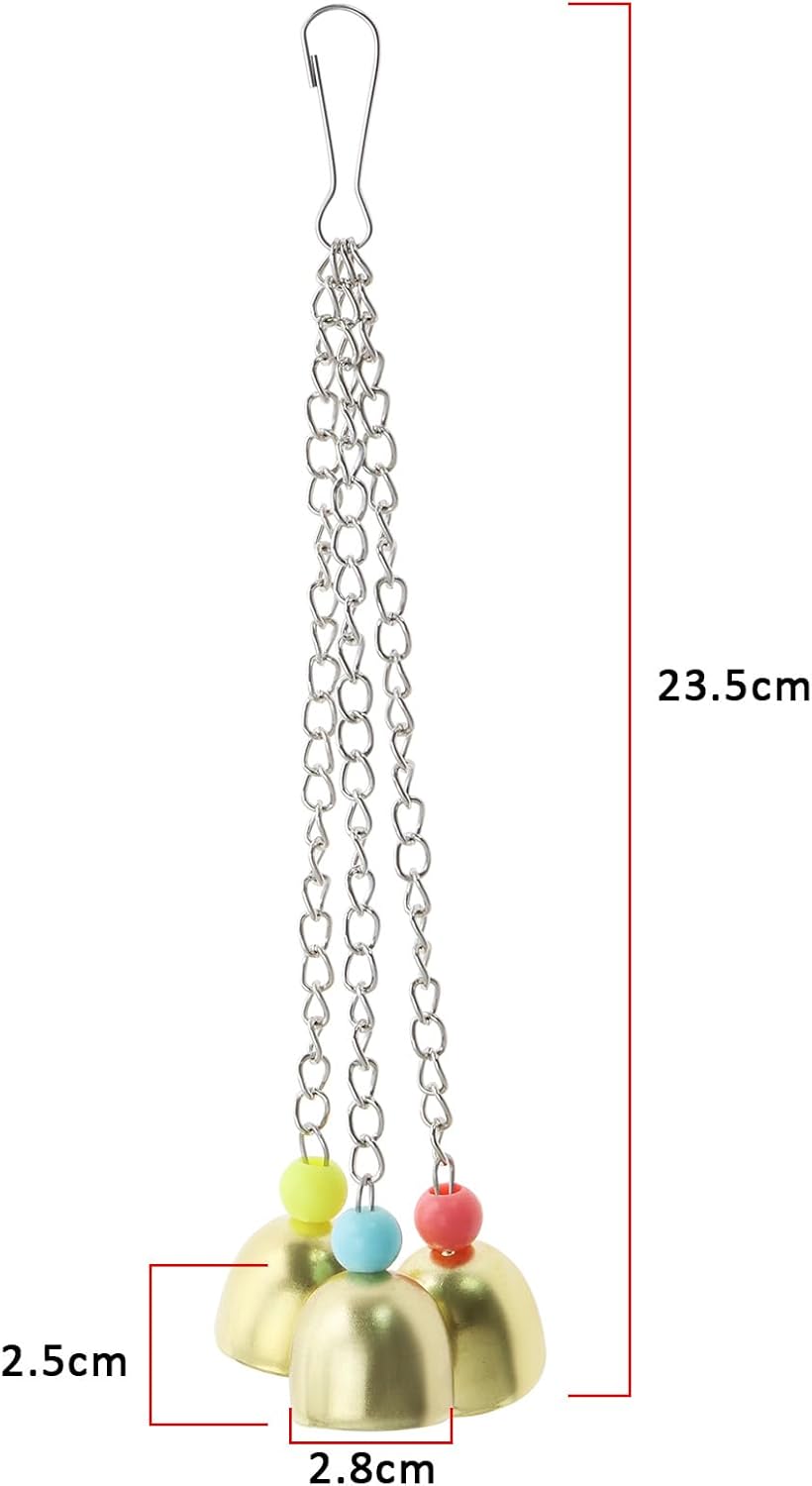 Each string of bells features three small bells hanging from a metal chain, with a total length of approximately 23.5cm and each bell measuring 28x25mm, providing auditory and visual stimulation for your pet bird.