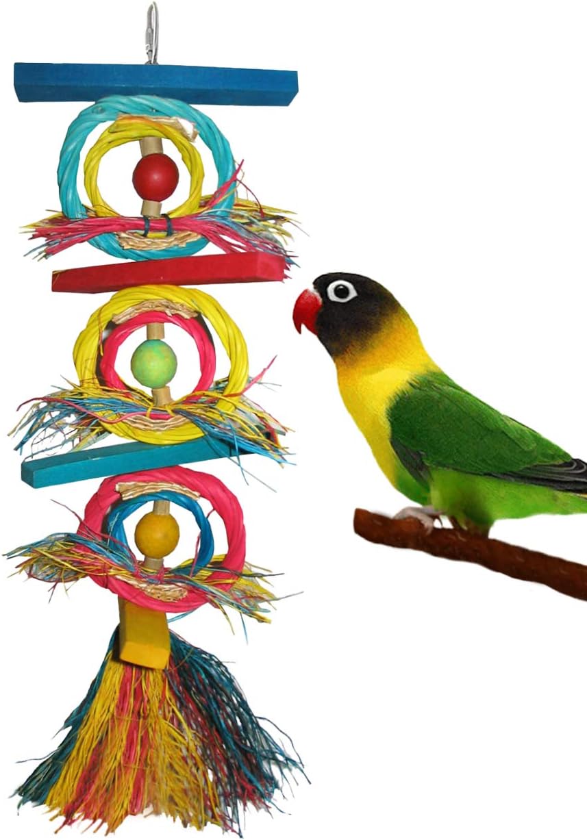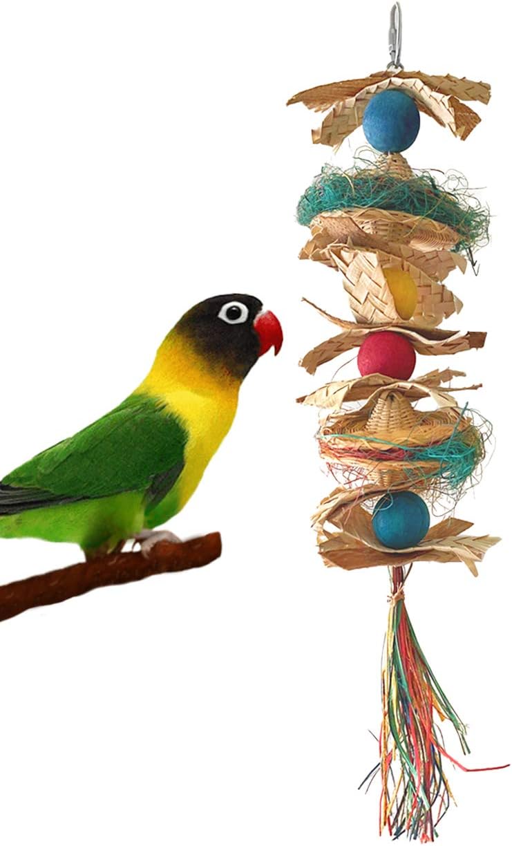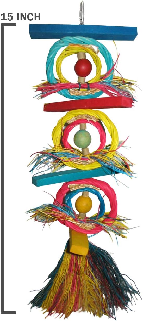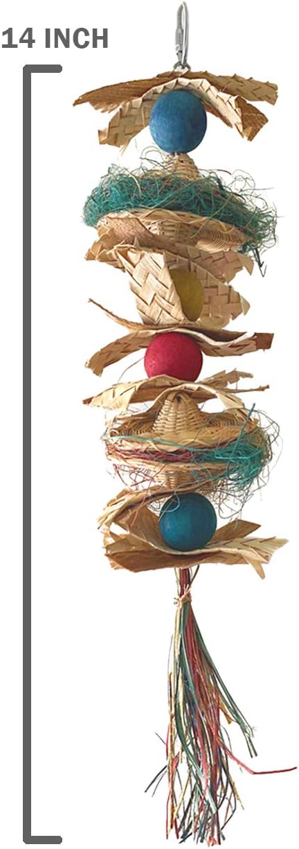 Chewriffic 15 inch Perfect for Birds Parrots that Love to Chew, Shred and Crunch! Made with Lots of Natural Materials and Textures. Colorful Wood, Bright Wicker Rings, Coconut Shreds, Sea Grass Strips and Bamboo Beads. Good for Small to Medium Sized BirdsParrots. Hat Hat Hooray 14 inch Packed with Fun. Perfect for Birds that Love to Shred, Chew and Crunch! Made with Lots of Natural Materials and Textures. Crunchy Palm Hats Stuffed with Colorful Coconut Fiber, Sea Grass Strips, Colorful Wood Beads. Good for Small to Medium Sized Birds Parrots.