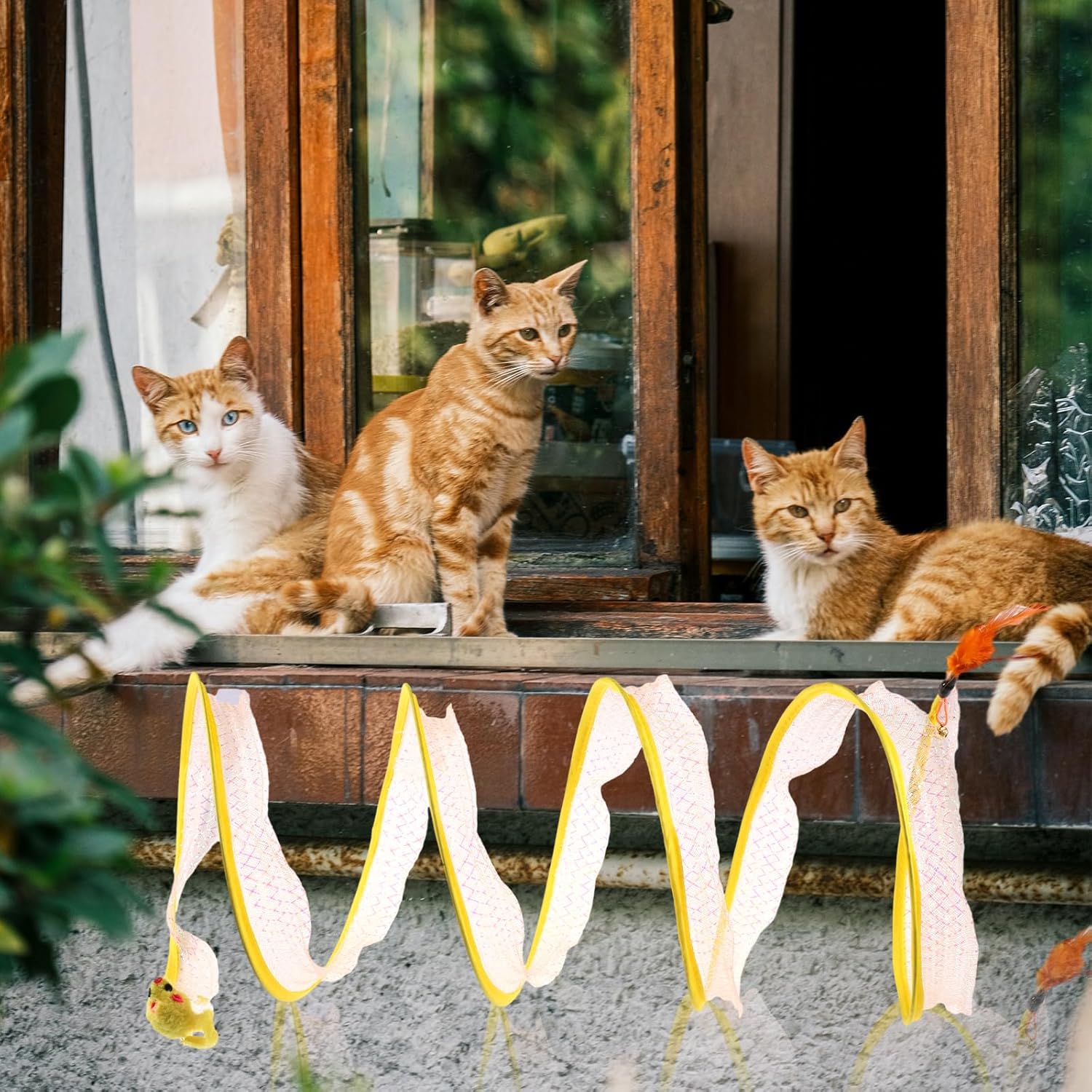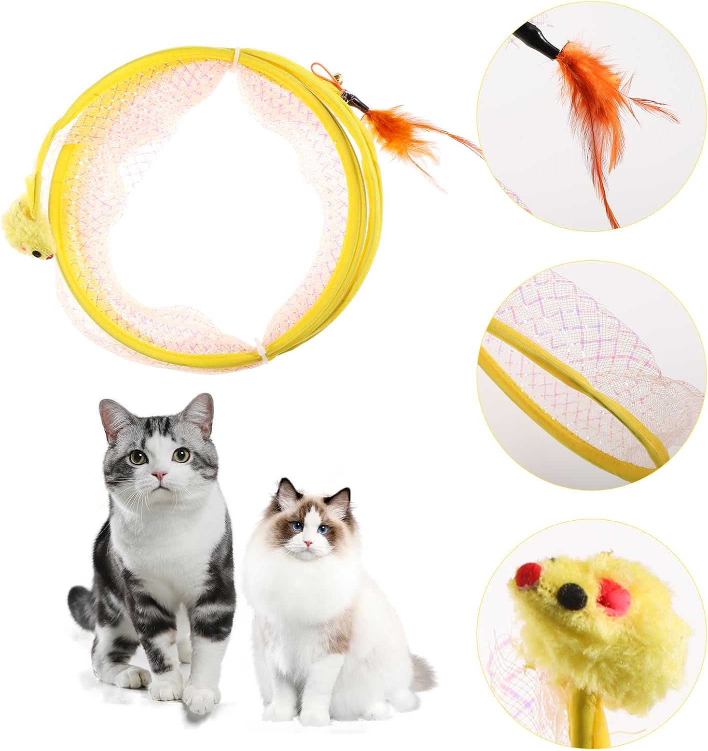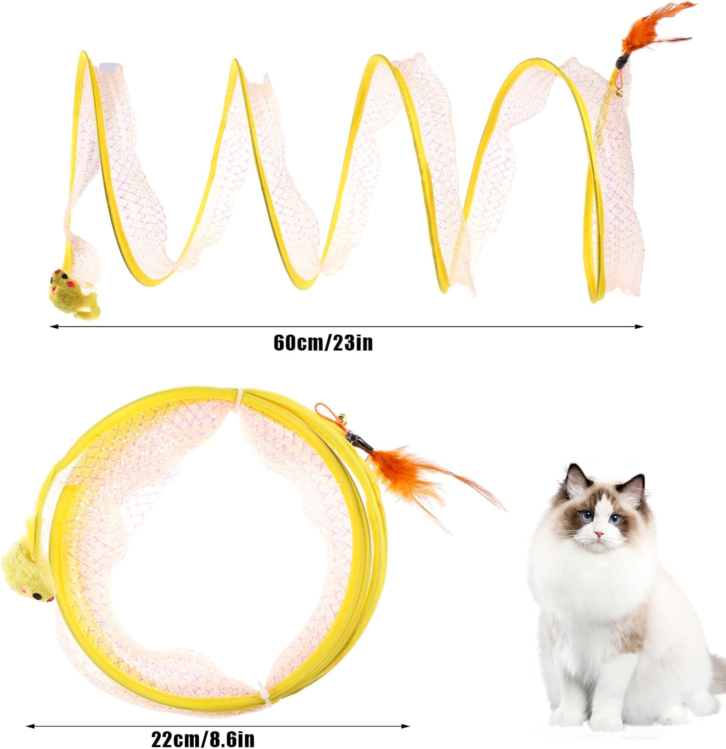 Multifunctional Toy: There are fluffy mice and feline feathers hanging on both sides of the cat spring tunnel, which is a foldable cat tunnel and also a cat teasing stick. This is a great toy for cats to explore and helps stimulate your cat’s curiosity.