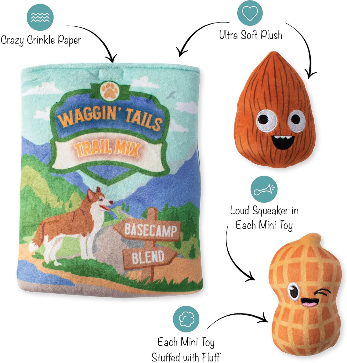 Take A Hike! Petshop by Fringe Studio “Waggin’ Tails Trail Mix” burrow bag toy set is made for active pups that enjoy interactive puzzle toys. This burrow bag set includes 2 mini toys each with a loud squeaker and crazy crinkle paper in the burrow bag. Simply hide the mini toys inside the burrow bag, squeak the mini toy or crinkle the bag and watch your dog try to get the toys out of the bag. This boredom buster will have your pup going nuts for these toys. Great for small dogs and not intended for aggressive chewers.