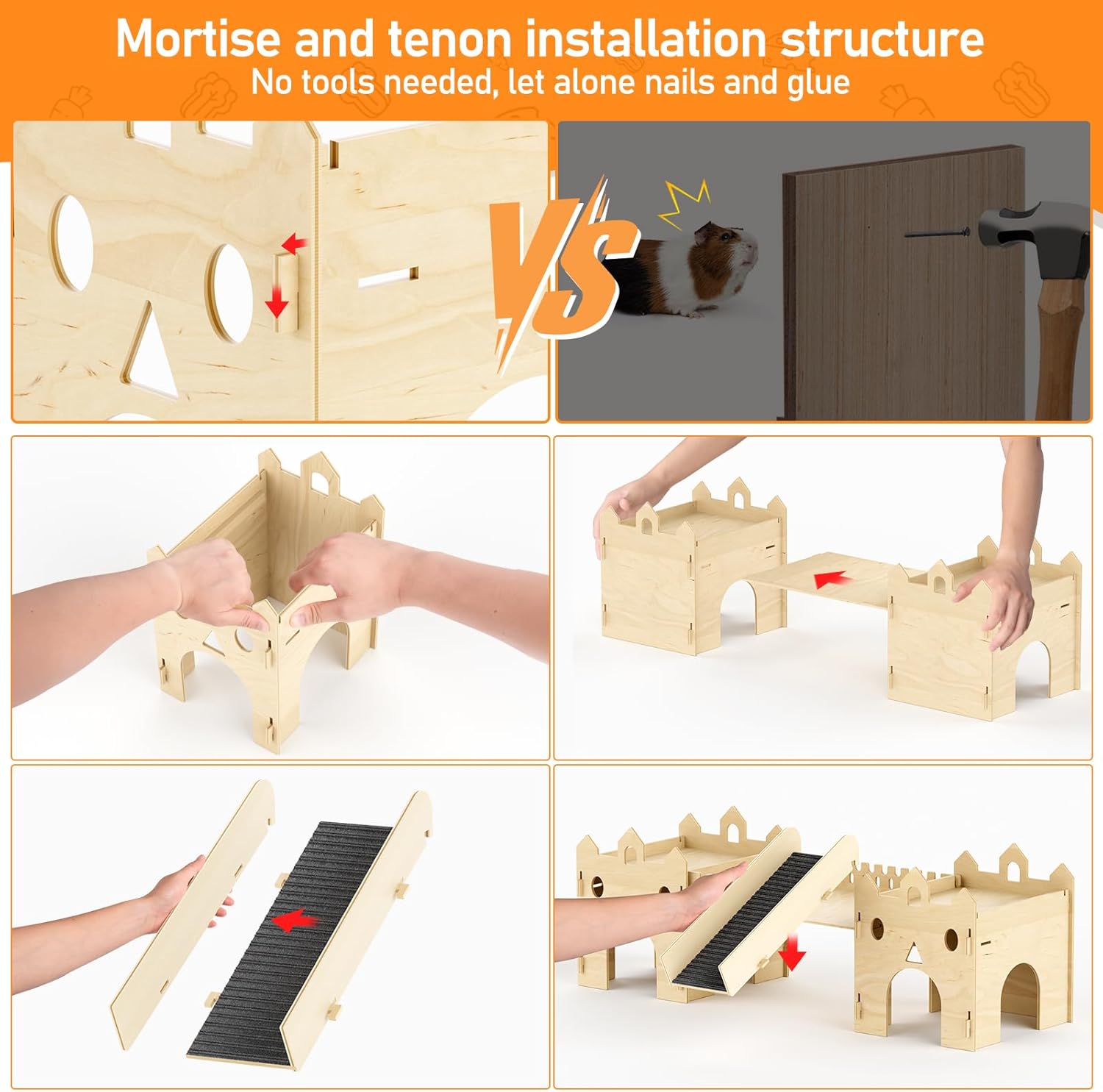 Easy Assembly & Cleaning: All boards can be inserted through mortise and tenon structure, without the need for extra nails or glue. The instruction manual reveals the naming and installation sequence of each component. The video on the link will also introduce how to install our dwarf bunny hide. Features detachable components, easily separate levels and ramp for quick wipe-downs, no more struggling with fixed structures.