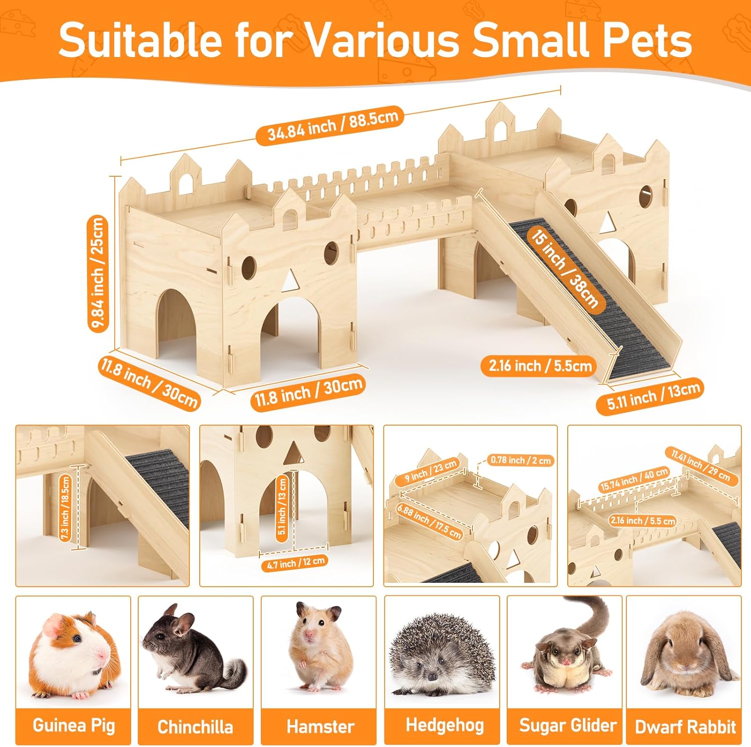 Versatile Habitat: Perfect as a cozy hideaway, stimulating playground, or a relaxing elevated lounge. Our dwarf rabbit castle complements cage or playpen setup, providing environmental enrichment for happier, healthier pets. Considering the doorway size, it may not be suitable for adult rabbits, but it can be a sweet house for small pets such as guinea pigs, hamsters, gerbils, hedgehogs, and bunnies. Its castle like appearance is definitely a beautiful decoration scenery in your home.