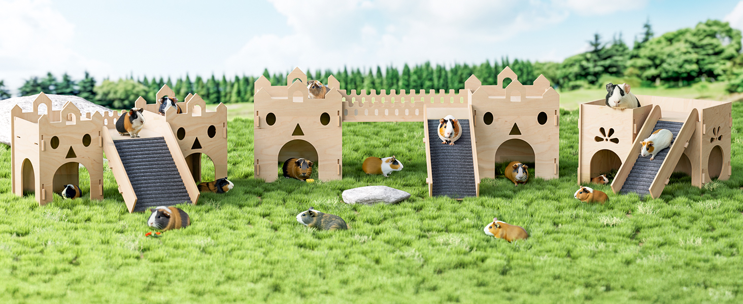 Ultimate Guinea Pig Paradise: Spacious multi-level guinea pig house provides essential hiding spots, climbing fun, and a secure lookout platform, satisfying your pet’s natural instincts to explore and feel safe. Your little pet can sleep peacefully or store their precious food at hiding points. Through the design of multiple exits, they can run freely in the hamster hides while enjoying high air circulation. And experience climbing fun and a secure lookout platform by climbing up the ladder.