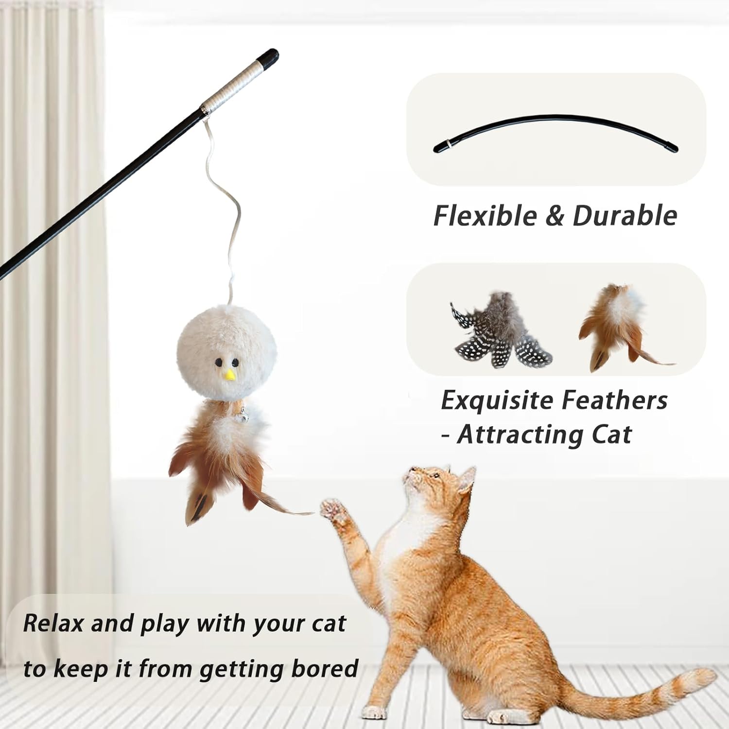 Interactive Cat Wand Toy Set,2 PCS Feather Plush Ball Cat Toys with Catnip & Bell Cats Teaser Sticks for Indoor Play Chase Exercise with Kittens
