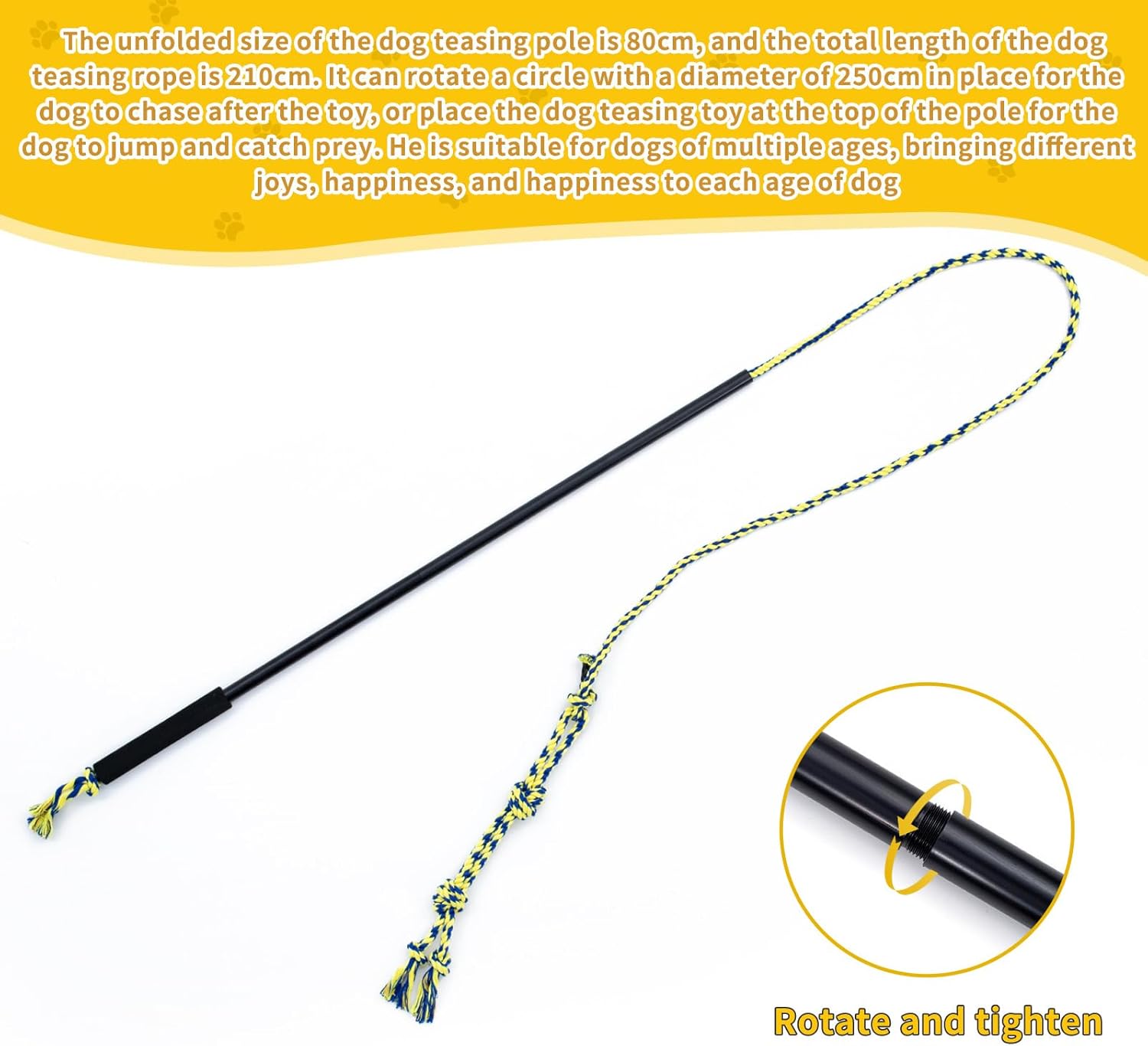 【Suitable Size for different dogs】- Length of holder: 33 inches, length of cord: 83 inches, length of rope: 14 inches. The flirt teaser wand pole toy for dogs keeps you and your dog at a suitable distance, attracts the dog to chase and run which allows the dog has fully exercise. A good tug of war dog toy for you dogd