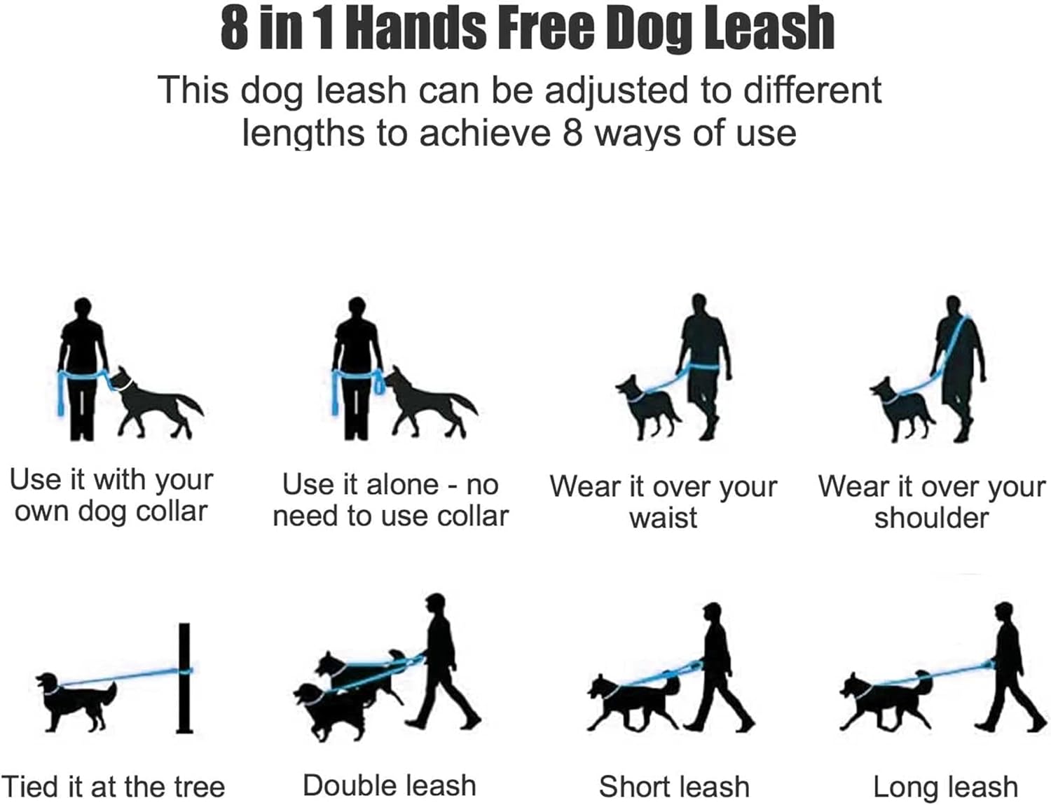 【8-in-1 Multifunctional Dog Leads】①Wear it over your shoulder to enjoy a hands-free walk ②Tie it around your waist to provide control to dogs in busy streets or vet visits ③Use one hand to hold two dogs at the same time ④Adjustable is great for service dog training, providing better safety and comfort