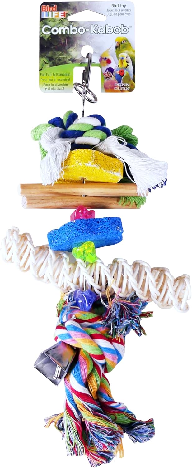 The Penn Plax Combo Kabob is a fun climbing toy for Cockatiels and other medium birds, measuring at 10 inches tall. The Combo Kabob has 6 different pecking and pulling toys to satisfy your bird’s natural instincts. It has a genuine copper bell that acts as a fun noise maker to keep your pet intrigued, a volcanic pumice stone, wooden sticks, and colorful rope. It also features a strong safety clasp that allows the Kabob to securely attach to all wired cages. The Combo Kabob is non-toxic, zinc-free and lead-free, which creates a safe environment for your bird. Shop Penn Plax for more Combo Kabob Bird toys in different styles and sizes, each sold separately.