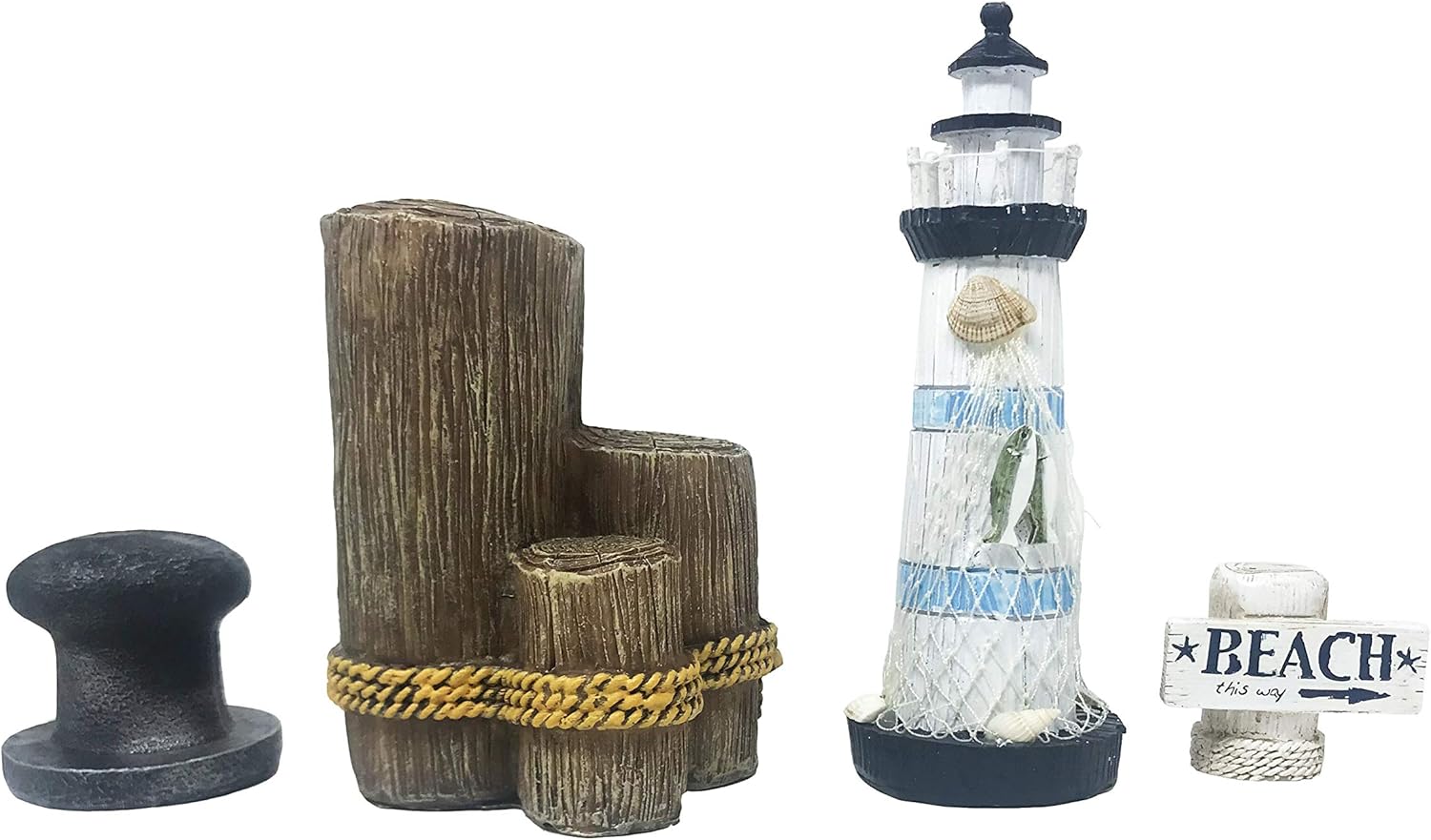 4-PIECE DECORATION KIT: Create a beautiful aquatic environment within just a few seconds with this Nautical & Beach Themed 4-Piece Aquarium Decorating Kit. This kit comes with 4 different decorations: Lighthouse, Mooring Bollard, Dock Pilings, and Beach Sign. Each aquarium ornament is finely detailed and fully colored.