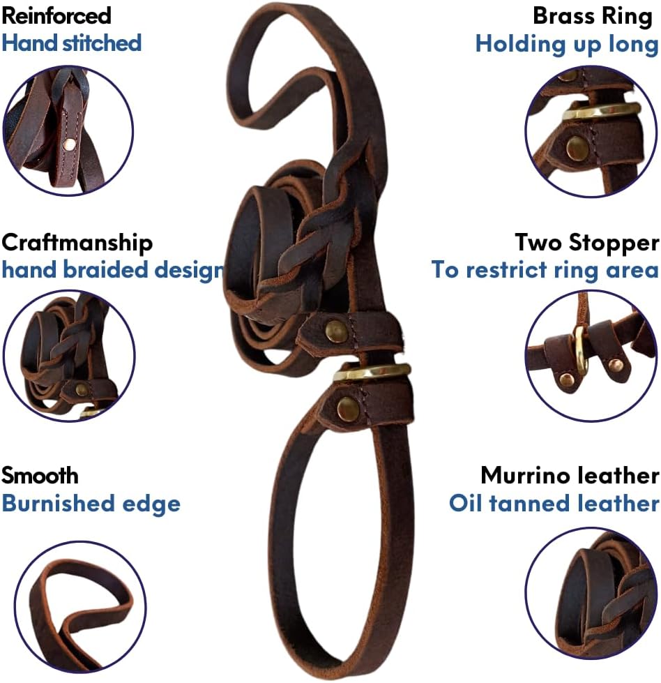 ADJUSTABLE COLLAR LOOP: Featuring a metal O-ring, this genuine leather slip leash adjusts easily to fit various neck sizes. The movable leather slip stopper ensures the collar stays securely in place, preventing any slipping off.