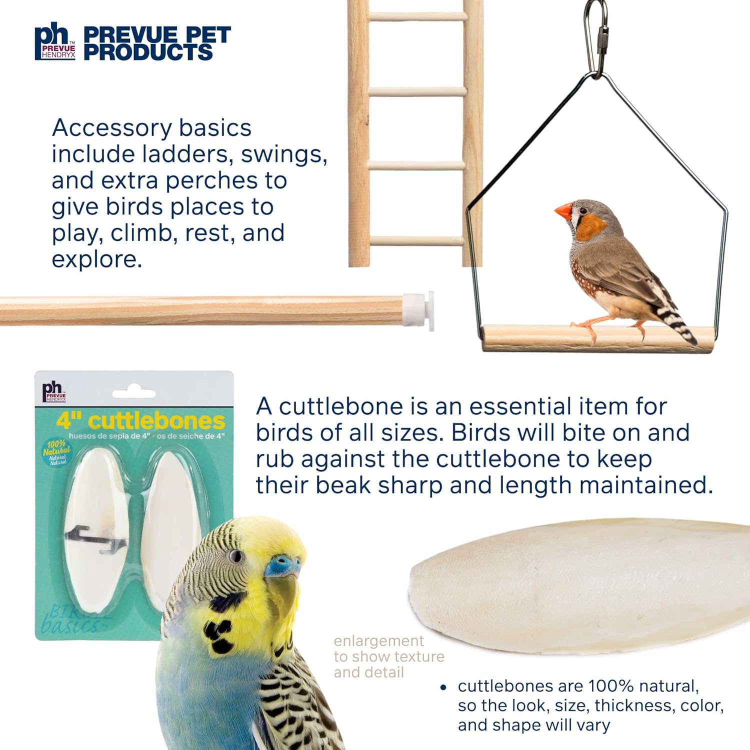 Includes ladder, swing, perches, cuttlebones, mirror toy, Preen & Pacify wooden stock toy with fibers, and Forage & Engage sisal and coconut fiber toy