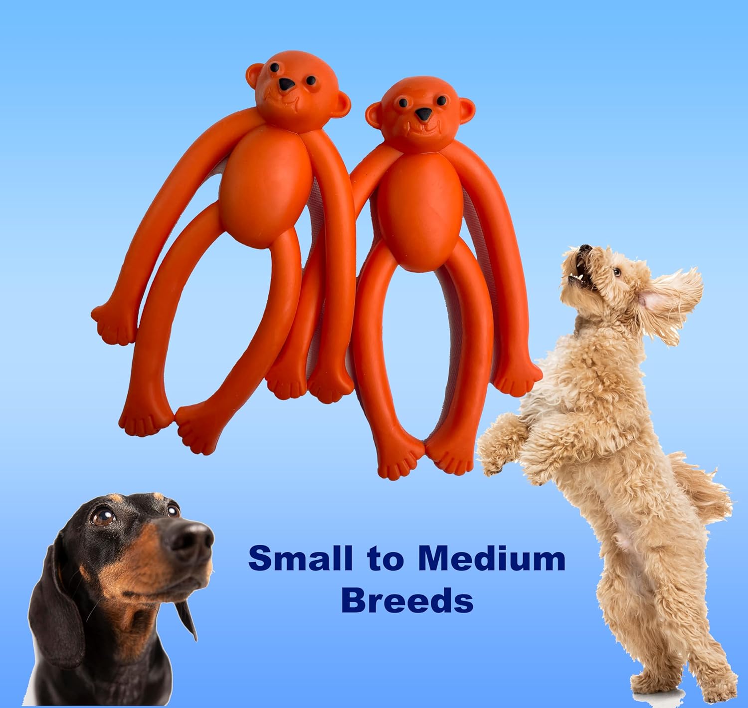 Bring home some dog-loving cute & fun chew toys from ShaggyTailVillage dog toys for aggressive chewers. This nearly indestructible dog toy is designed to keep your pup engaged for longer and provide hours of safe entertainment and chewing fun! Comes in a pack with two orange rubber monkeys made from tough TPR rubber making them perfect for aggressive chewers, teething puppies, small and medium dogs. These durable rubber toys are ideal puppy essentials and great additions to any pet supplies collection as they’re strong enough to withstand aggressive chewing but still gentle on their gums and teeth. Your pup will love playing fetch with our long legged rubber monkeys. Plus, they promote healthy dental hygiene- something both you and your pup wont argue the benefits of! Your pup deserves nothing but the best so let us make sure they have the most enjoyable experience possible with ShaggyTailVillage dog products and puppy toys. The rubber monkey dog toys are carefully designed with your pup’s safety in mind – made from non-toxic TPR rubber materials.