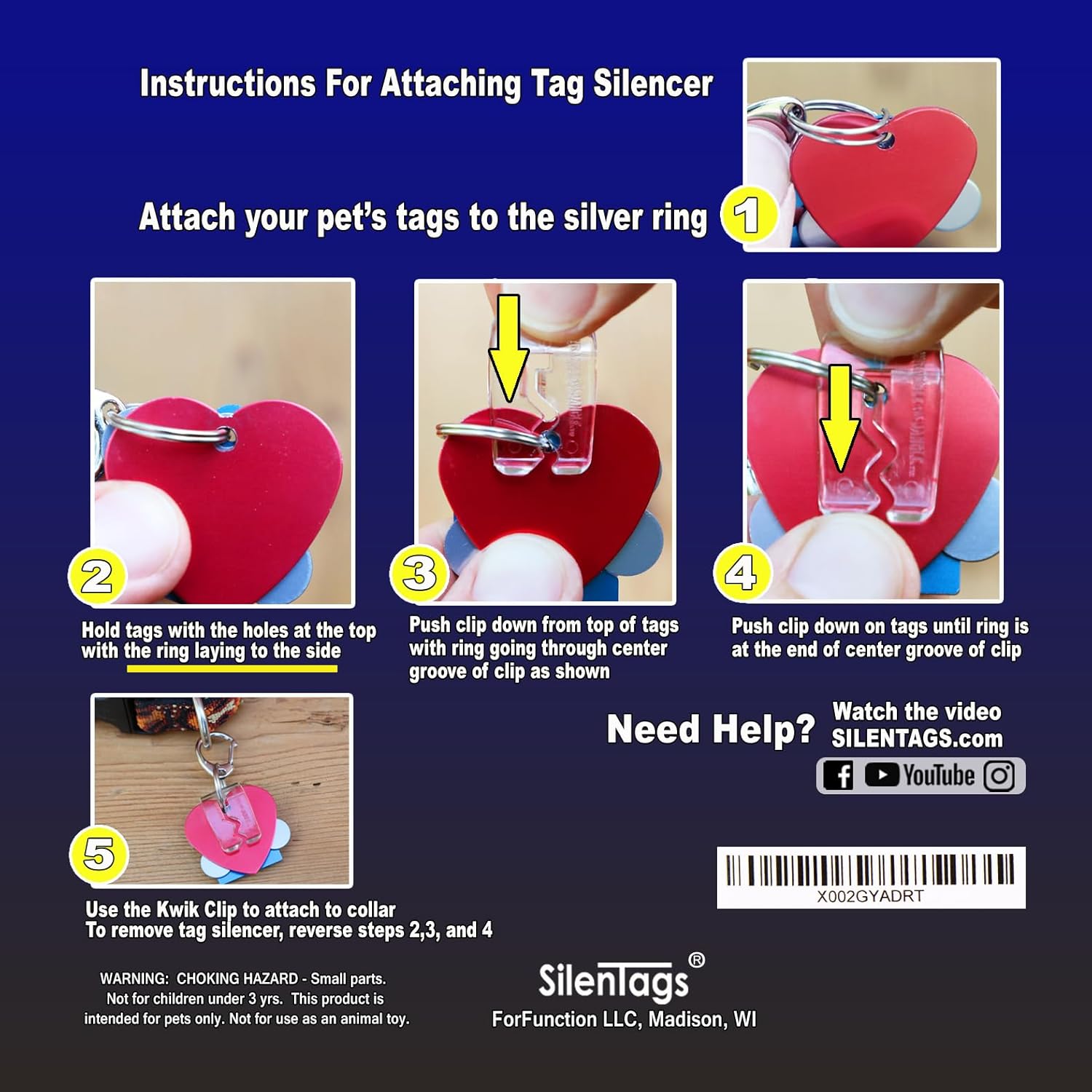 With the Kwik Clip you can easily clip your dog’s tags from one collar to another. It comes with a tag ring and our popular clear SilenTags tag silencer which clips 2-5 standard thickness tags of most shapes. Easy instructions on how to use SilenTags are shown in the photo below and are on the back of the package.