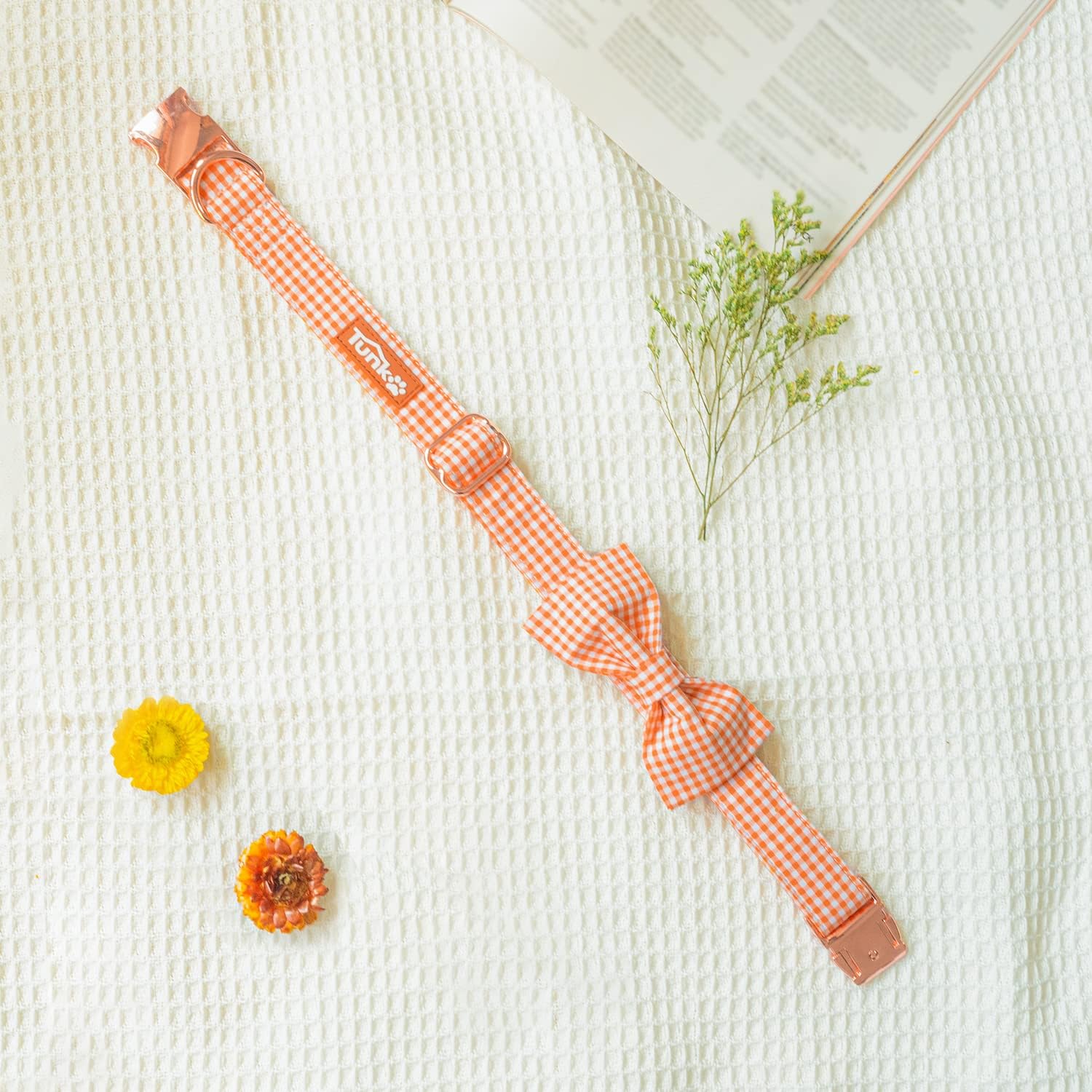 Tunkoo Dog Collar with Bow Tie Elegant Plaid Soft Comfy Cotton Adjustable Collar Premium Metal Buckle,Small Medium Large Puppy Cat Outdoor Training Walking Running(Orange Grid,M)